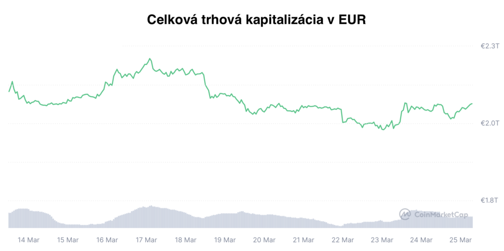 Trh kryptomien sa za uplynulých 14 dní pohyboval do strany s pomerne vysokou volatilitou. Celková trhová kapitalizácia trhu sa za toto obdobie zvýšila o zhruba 1 % a aktuálne sa nachádza na úrovni 2,10 bilióna eur. Samotný Bitcoin počas tohto obdobia zostal takmer na nezmenenej úrovni s minimálnym rastom 0,04 % a jeho cena sa pohybuje okolo 61 200 €.
